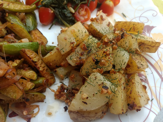 Heat oil and melt butter. Add garlic and saute for a min, don't overcook. Add cooked potatoes and arrange in one layer. In medium heat cook until the sides are golden.